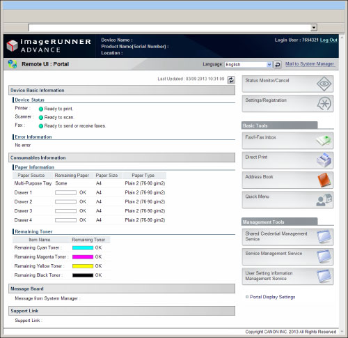 Once this is achieved, start your web browser and enter the machine's IP address. The Remote UI screen appears on your computer screen and is ready for use.
