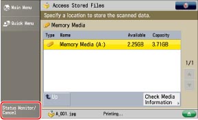 You can cancel printing a stored file from the touch panel display or from the Status Monitor/Cancel screen.