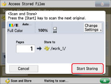 If the following screen is displayed, after the last batch of originals is scanned, press [Start Storing].