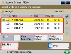 You can check the detailed information for files on the memory media (file name, location, date modified etc.), and add or delete files.