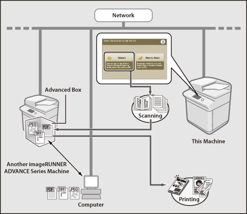 By selecting the Advanced Space of another imageRUNNER ADVANCE series machine from [Network], you can scan a document with this machine, and store it in the Advanced Space of the other imageRUNNER ADVANCE series machine. You can also use this machine to print files stored in another imageRUNNER ADVANCE series machine on the network.