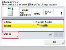 You can use the Setting Confirmation screen to confirm, change, or cancel selected copy modes.