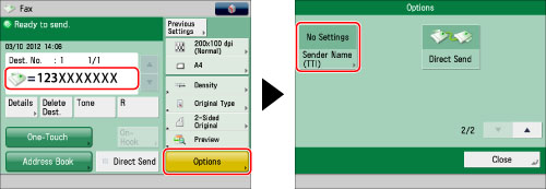 Specify the destination → press [Options] → [Sender Name (TTI)].