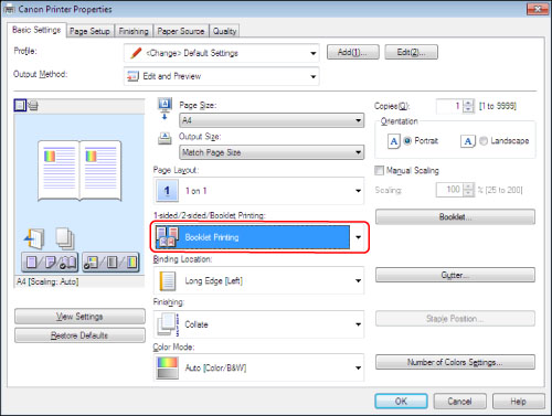 In the [Basic Settings] tab, select [Booklet Printing] from the [1-sided/2-sided/Booklet Printing] drop-down list.