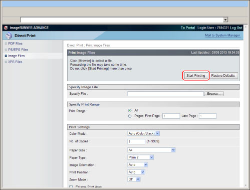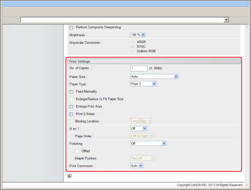 If [Auto] is selected, the image is printed in the specified position of the paper if the print position for the image is specified. If the print position is not specified, the image is printed in the centre of the paper.