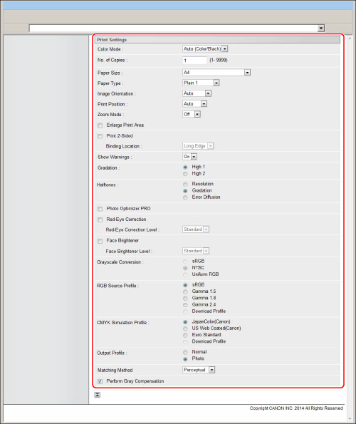 These settings enable you to select the gamma correct level of the RGB data. The higher the value, the darker the printout. [Download Profile]