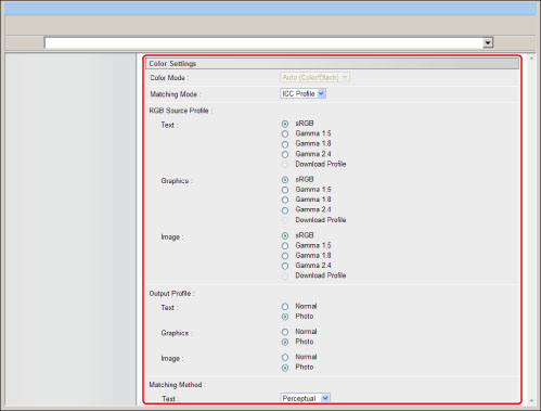 This setting enables you to set the type of colour matching method to apply for each text, graphics, and image that make the print job, or for each colour space, such as RGB and CMYK.