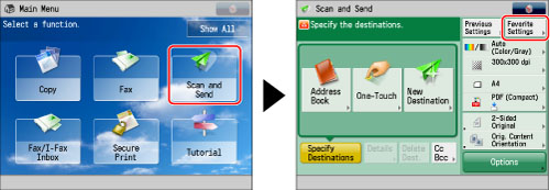 To use this feature, you must first register the desired document settings and destinations in a favorite settings button. For instructions on registering destinations and settings in a favorite settings button, see "Registering/Editing Favorite Settings."
