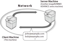 The machine can access a server machine on the network as a client machine to search for/specify destinations from the Address Book of the server machine.