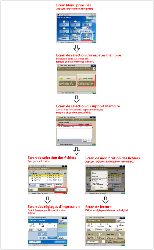 Pour prendre connaissance de la procédure concernant [Ajout. fichiers (Lire et mémoriser)] et obtenir plus d'informations sur l'utilisation de l'écran Lire, voir "Ajout d'un fichier (Lire et mémoriser)" et "Flux des opérations de lecture et de mémorisation".