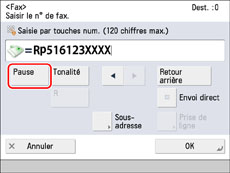 Appuyer sur [Pause] une fois la saisie du numéro d'accès de la ligne extérieure terminée ("R" dans l'exemple précédent) et avant de saisir le numéro de fax.