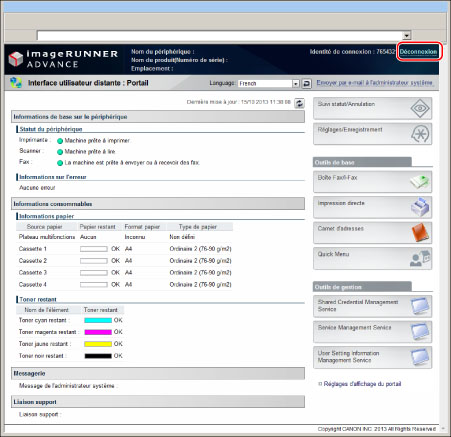 Pour plus d'informations sur la configuration système de l'interface utilisateur distante et les étapes préliminaires au lancement de cette interface, voir "Environnements système nécessaires" et "Avant de commencer à utiliser l'interface utilisateur distante".
