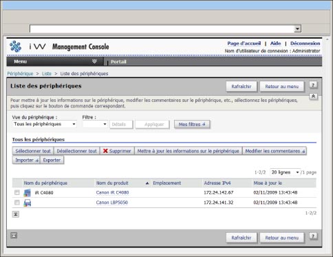 Plusieurs machines connectées au réseau peuvent être gérées de manière centralisée à l'aide de iW Management Console, accessible via un navigateur Web. Il est possible d'afficher la liste des informations (telles que les paramètres réseau, l'emplacement d'installation et l'état du périphérique) extraites des machines du réseau et envoyer un e-mail à l'administrateur pour l'informer des changements d'état du périphérique. Il est également possible de définir ces réglages pour un lot de machines. Ces machines peuvent être gérées par l'administrateur système. Il suffit pour cela d'indiquer la date et l'heure souhaitées pour l'application automatique des réglages des machines.