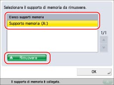 Per rimuovere il supporto memoria dalla macchina, attenersi alla seguente procedura. Se il supporto memoria viene rimosso dalla macchina con una procedura diversa da quella riportata di seguito, potrebbero verificarsi danni al supporto memoria e alla macchina.