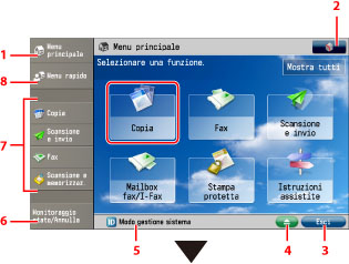 Visualizzare la schermata Menu principale. Se la schermata Menu principale non viene visualizzata quando si utilizza una funzione, occorre selezionare [Menu principale] prima di utilizzare la macchina. Per visualizzare tutte le funzioni, premere [Mostra tutti].