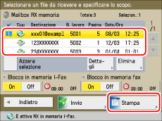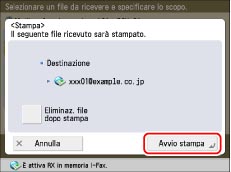 Se si imposta 'Off' per <Blocco in memoria fax> e/o <Blocco in memoria I-Fax>, i file ricevuti con la funzione fax/I-fax vengono stampati automaticamente ed eliminati dalla mailbox RX memoria.