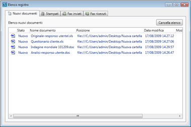 Facendo clic su [Elenco registro] nella finestra di notifica nuovo documento, appare la finestra [Elenco registro]. Selezionando o facendo doppio clic su una voce nell'elenco dei nuovi documenti dalla schermata [Elenco registro], viene lanciato Desktop Browser e nel riquadro di visualizzazione elenco file vengono visualizzati le voci all'interno delle cartelle con nuovi documenti.