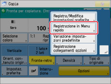 Registrando le impostazioni utilizzate di frequente per funzioni quali Copia, Scansione e invio e Scansione e memorizzazione nel Menu rapido, è possibile utilizzare le impostazioni registrate anche su un'altra macchina.