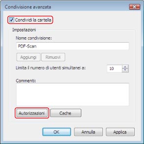 Per Windows Vista/Windows 7/Windows 8, fare clic con il pulsante destro del mouse sulla cartella "PDF-Scan" → selezionare [Proprietà] per visualizzare la finestra di dialogo [Proprietà PDF-Scan] → fare clic sulla scheda [Condivisione] → fare clic su [Condivisione avanzata] → selezionare [Condividi la cartella] → fare clic su [Autorizzazioni].