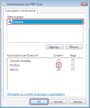 Selezionare [Everyone] → verificare che sia selezionato <Modifica> per [Consentire] → fare clic su [OK]. Se non è selezionato [Modifica], selezionare [Consentire] → fare clic su [OK].