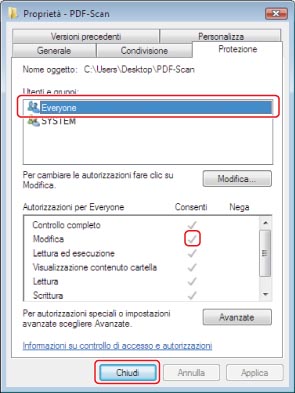 Per Windows Vista/7/8, selezionare [Everyone] → selezionare [Consentire] per <Modifica> → fare clic su [OK] → [Chiudi].