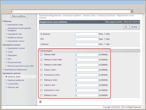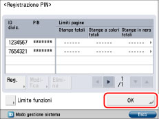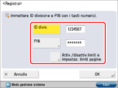 Specificare ID divisione e PIN → premere [Attiv./disattiv.limiti e impostaz. limiti pagine].