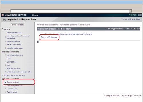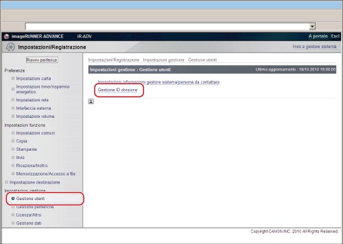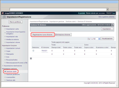 Accedere alla IU remota → fare clic su [Impostazioni/Registrazione] → [Gestione utenti] → [Gestione ID divisione].