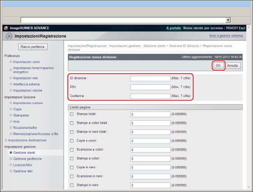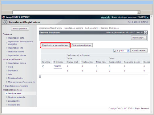 Accedere alla IU remota → fare clic su [Impostazioni/Registrazione] → [Gestione utenti] → [Gestione ID divisione] → [Registrazione nuova divisione].