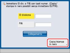 Se [Consentire lavori copiatura/stampa in nero] è impostato su 'On', sotto il campo di immissione dell'ID divisione viene visualizzato [Copia/stampa in nero]. Premendo [Copia/stampa in nero] sarà possibile stampare documenti in bianco e nero senza immettere l'ID divisione.