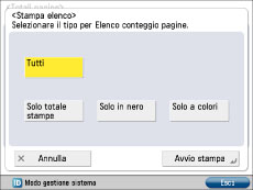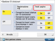 (Impostazioni/Registrazione) → [Impostazioni gestione] → [Gestione utenti] → [Gestione ID divisione] → [On] → [Totali pagine].