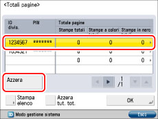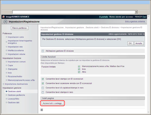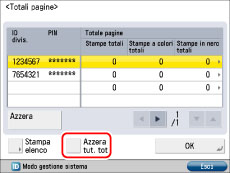 Per azzerare i conteggi di tutte le divisioni, fare clic su [Impostazioni] nella schermata di Gestione ID divisione → fare clic su [Azzera tutti i conteggi].