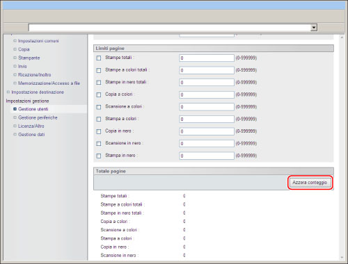 È possibile gestire i totali e impostare i limiti di pagine per scansioni a colori e per copie, scansioni e stampe in bianco e nero per ogni scheda.