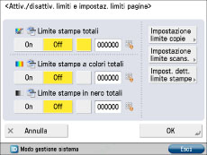 Se il numero raggiunge il limite, la funzione per la quale è stato raggiunto il limite non potrà essere utilizzata a meno che il modo Limiti pagine non venga disabilitato o che l'impostazione non venga modificata.