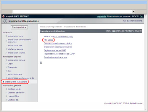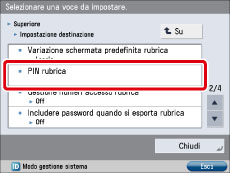 Accedere alla IU remota → fare clic su [Impostazioni/Registrazione] → [Impostazione destinazione] → [PIN rubrica].