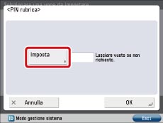 È possibile impostare un PIN per la Rubrica, da utilizzare per l'invio di fax e per le scansioni. Impostando un PIN, è possibile limitare le operazioni di registrazione, modifica, aggiunta e cancellazione delle destinazioni. Per il PIN della Rubrica è possibile immettere fino a sette cifre.