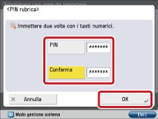 Selezionare [Impostazione PIN rubrica] → immettere fino a sette cifre per <PIN rubrica> e <Conferma>.