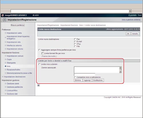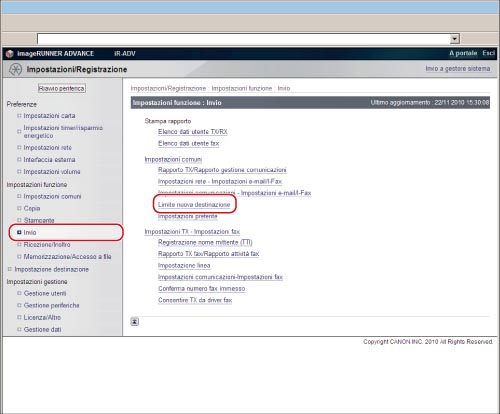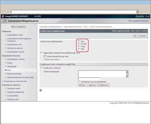 Accedere alla IU remota → fare clic su [Impostazioni/Registrazione] → [Invio] → [Limite nuova destinazione].