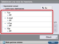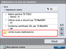 (Impostazioni/Registrazione) → [Impostazioni funzione] → [Invio] → [Impostazioni comuni] → [Limite nuova destinazione].