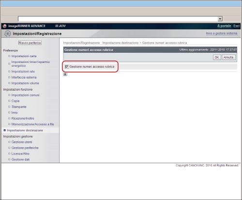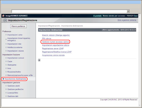 Accedere alla IU remota → fare clic su [Impostazioni/Registrazione] → [Impostazione destinazione] → [Gestione numeri accesso rubrica].