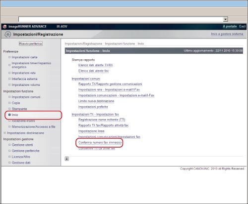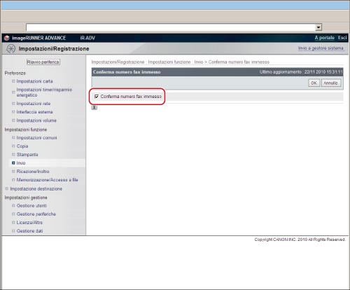 Accedere alla IU remota → fare clic su [Impostazioni/Registrazione] → [Invio] → [Conferma numero fax immesso].