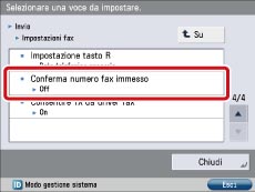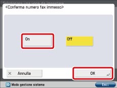 (Impostazioni/Registrazione) → [Impostazioni funzione] → [Invio] → [Impostazioni fax] → [Conferma numero fax immesso].