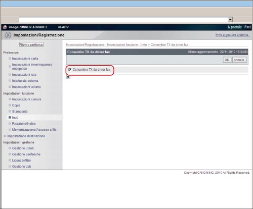 Accedere alla IU remota → fare clic su [Impostazioni/Registrazione] → [Invio] → [Consentire TX da driver fax].