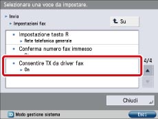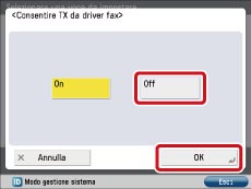 (Impostazioni/Registrazione) → [Impostazioni funzione] → [Invio] → [Impostazioni fax] → [Consentire TX da driver fax].