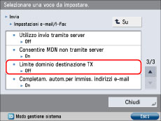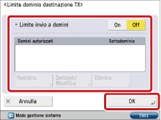 (Impostazioni/Registrazione) → [Impostazioni funzione] → [Invio] → [Impostazioni e-mail/I-Fax] → [Limite dominio destinazione TX].