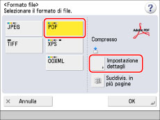 Specificare la destinazione → premere il pulsante Formato file → [PDF] → [Impostazione dettagli].