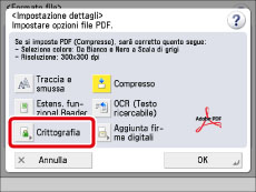 È possibile impostare una password per l'apertura di un file PDF o per crittografare lo stesso file PDF per inviarlo. Se si imposta una password per un file PDF, solo i destinatari che immettono la password corretta potranno aprirlo, modificarlo o stamparlo. Inoltre, è possibile garantire privilegi di modifica/operativi in base alla sensibilità delle informazioni (richiesto kit opzionale).