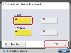 (2) Selezionare [On] per [Utilizzo server WebDAV] → premere [OK].