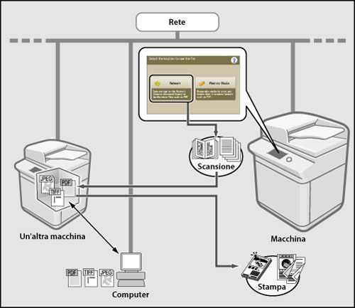 È possibile salvare originali acquisiti dalla macchina nell'Area di condivisione di un'altra macchina della serie imageRUNNER ADVANCE remota e accessibile in rete. È inoltre possibile richiamare i file salvati in un'Area di condivisione in rete e stamparli dalla macchina.