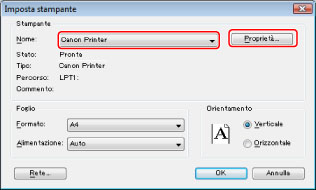 Nel menu [Archivio] del software applicativo utilizzato per la stampa del documento, selezionare [Stampa] per visualizzare la finestra di dialogo [Stampa] → selezionare la stampante da usare → fare clic su [Proprietà].