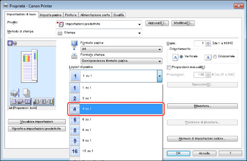 Nella scheda [Impostazioni di base], selezionare [4 su 1] dall'elenco a comparsa [Layout di pagina].